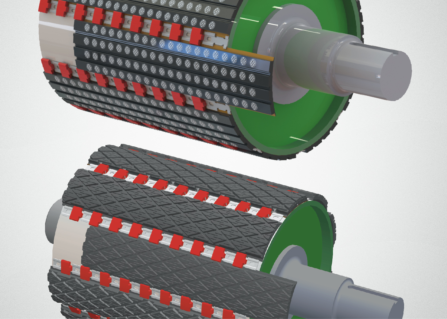 Diamond rubber and raised round ceramic replaceable laggings fit the curved surface for any pulley diameter.