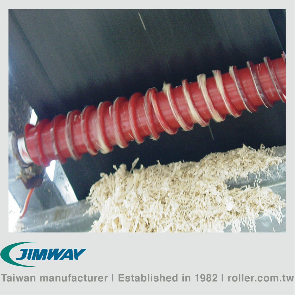 USED WHERE STICKY MATERIALS ADHERE TO THE BELT, JIMWAY'S SPRIAL RETURN ROLLER IS A SOLUTION FOR SHEDDING STICKY MATERIAL AND MAINTAINING PROPER BELT TRACKING.