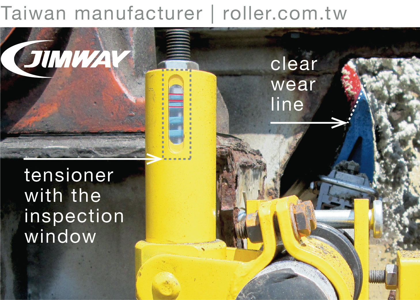 Performing a visual inspection for wear, Jimway's C1UD belt cleaner blade with bi-color design ensures workers easily to inspect when replace worn blades. The another main feature of this belt cleaner is the tensioner with blade-to-belt pressure inspection window, which makes timely and effective adjustments to increase scraping performance. Carryback adheres to the belt, which causes serious material accumulation and residue build-up return rollers. Therefore, belt mistracking or belt-edge damage results in unscheduled downtime.––––––––––––––––––––––––––––––––––––––