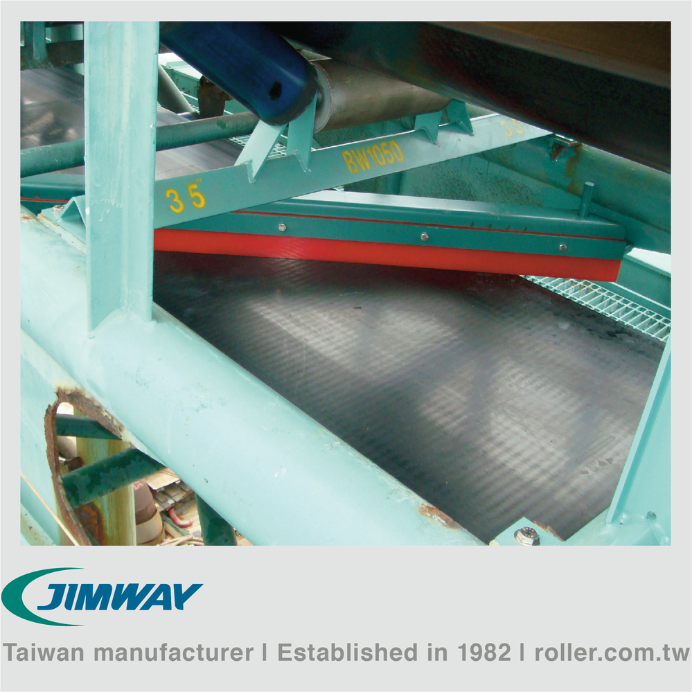Jimway's NNC belt cleaner is designed to protect against carryback that may fall onto the inside of the return belt and cause damage or mistracking. Meanwhile, it protects tail pulleys, mechanical splices and pulley lagging. Carryback adheres to the belt, which may causes residue build-up on tail pulleys. Therefore, belt mistracking or belt-edge damage results in unscheduled downtime. The diagonal plow belt cleaner is no maintenance needed and floats on the belt surface to remove residue without needing adjustment.––––––––––––––––––––––––––––––––––––––